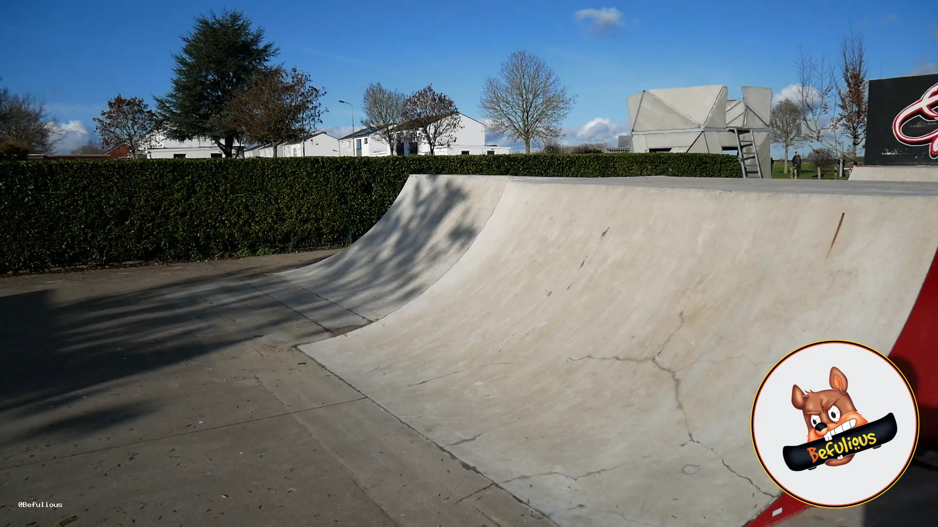 Pour finir notre petit tour dans ce spot, on trouve deux belles courbes séparées par un plan incliné et collées à un mur. On peut y faire plein de tricks différents comme un BS Heelflip 180 par exemple.