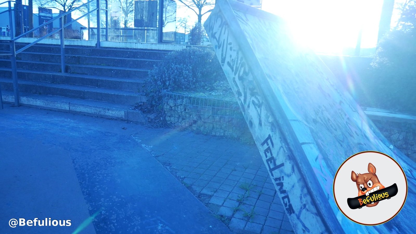 Quand on arrive dans le skatepark, on trouve directement un set de marches, avec deux ledges en pente, un rail plat en pente ainsi qu'un plan incliné pour s'élancer dans le skatepark. Ce spot est quand même assez costaud!